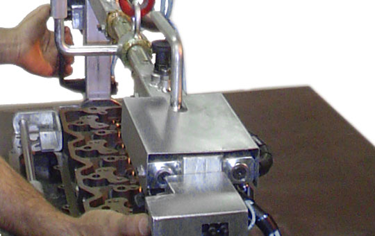 Projetado para manipular blocos de motores leves, este dispositivo Seman, fabricado em estrutura tubular de aço, pode ser montado diretamente em um balancim pneumático, ou braço mecânico, para viabilizar a movimentação do produto manipulado.